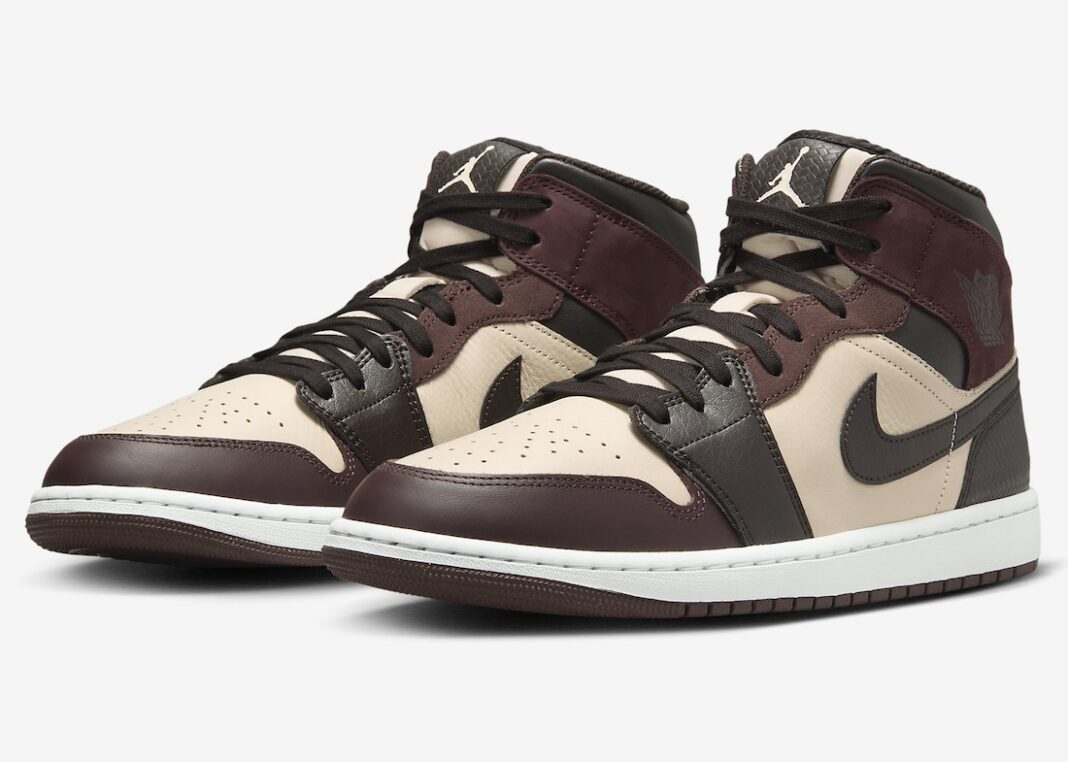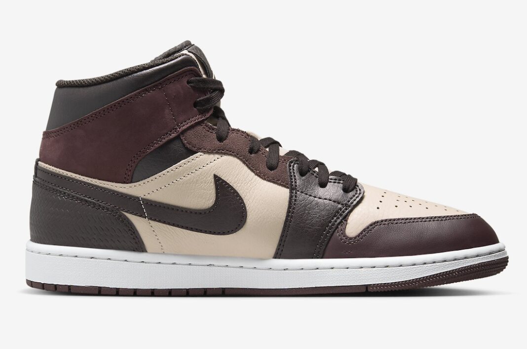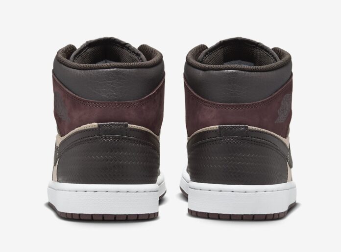 This is a mid-top version of the iconic Air Jordan 1 silhouette. The shoe features a premium leather and suede construction with a color palette that combines deep burgundy, dark chocolate brown, and light beige tones. Key details include: