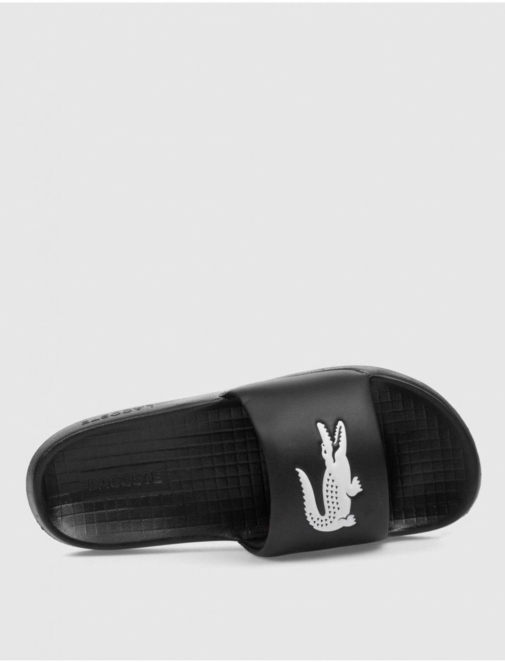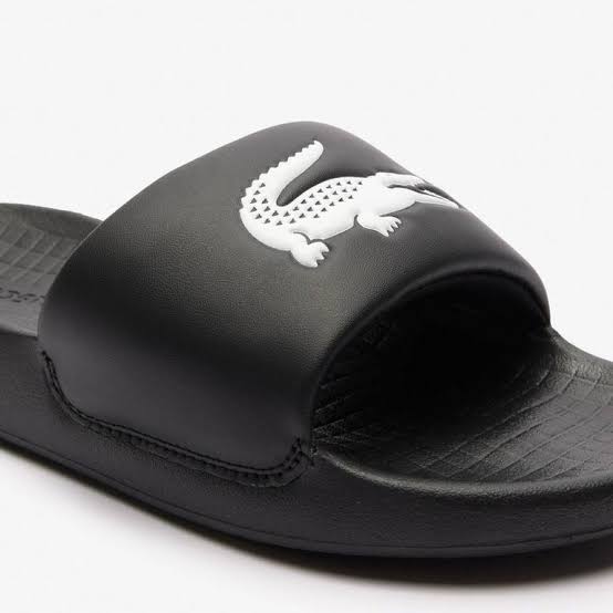 These Lacoste slide sandals feature a sleek, minimalist design in black with the iconic embroidered white Lacoste crocodile logo prominently displayed on the strap. Crafted from durable synthetic material, they offer a cushioned footbed for superior comfort and a textured outsole for grip and stability. Perfect for casual wear, poolside lounging, or summer outings, these slides combine sporty elegance with everyday practicality.