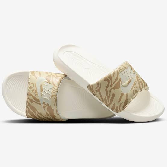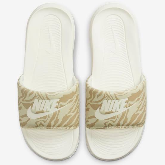 The Nike Victori One Animal Print Slide Sandals feature a stylish beige and white zebra-inspired pattern on the strap, paired with the iconic Nike logo in white for a bold, sporty look. Designed for comfort, these slides include a contoured footbed with soft cushioning and a textured outsole for grip and durability. Perfect for casual wear, poolside lounging, or post-workout relaxation, they combine eye-catching design with everyday functionality.
