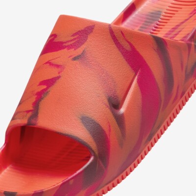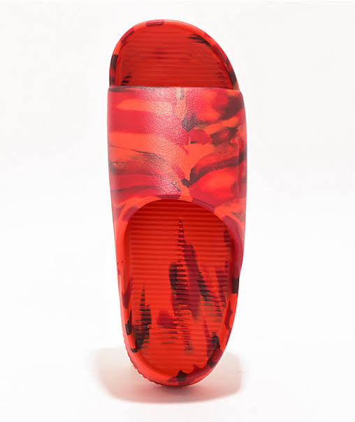These Nike Victori One Printed Slide Sandals feature a bold and vibrant red colorway with an abstract black flame-like pattern for a striking look. Designed for comfort and style, they include a contoured footbed for cushioning and support, along with a wide synthetic strap for a secure fit. The lightweight construction and textured outsole provide traction, making them ideal for casual wear, poolside lounging, or post-workout relaxation.